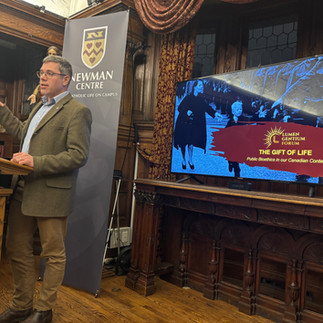 Now in its second year, the Lumen Gentium Forum would simply not be possible without the collaboration and partnership of a growing number of friends: our alumni, current Fellows, financial and spiritual patrons, as well as our many presenters and institutional partners. To bring together this incredible community, we launched the Leo XIII Dinner this past February: a new annual gathering of friends of the Lumen Gentium Forum, taking place at a regular monthly meeting of the fellowship, where guests enjoy a small taste of the Forum's formation experience. In addition to enjoying the fellowship of each other's company and a beautiful home-cooked meal from our friends at the Newman Centre at University of Toronto, we were thrilled to welcome Dr. Cory Labrecque: a professor at Laval University, president of the Canadian Bioethics Society, and a Vatican advisor on issues of bioethics and end-of-life issues. This was Dr. Labrecque's second time presenting in our program. Once again, he offered a passionate and moving presentation on Catholic bioethics on end-of-life and the dark realities of legalized euthanasia in Canada. Despite the difficult topic, the presentation was defined by hope, as Dr. Labrecque offered our listeners concrete ways that we as Christians might accompany those who are dying, and bring fresh perspective to public conversations about the meaning of suffering and what it means to die well.
